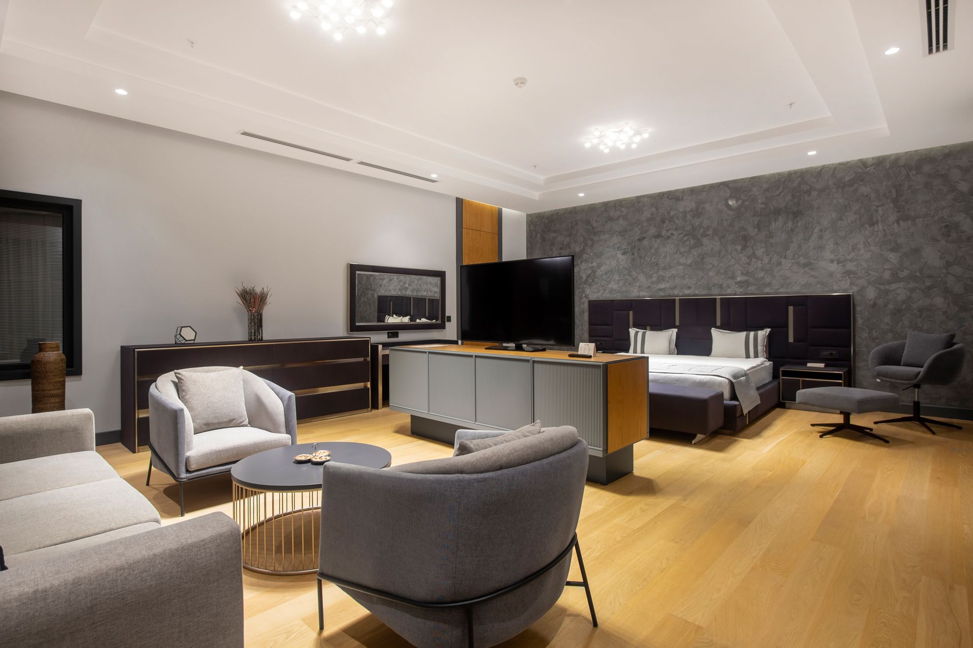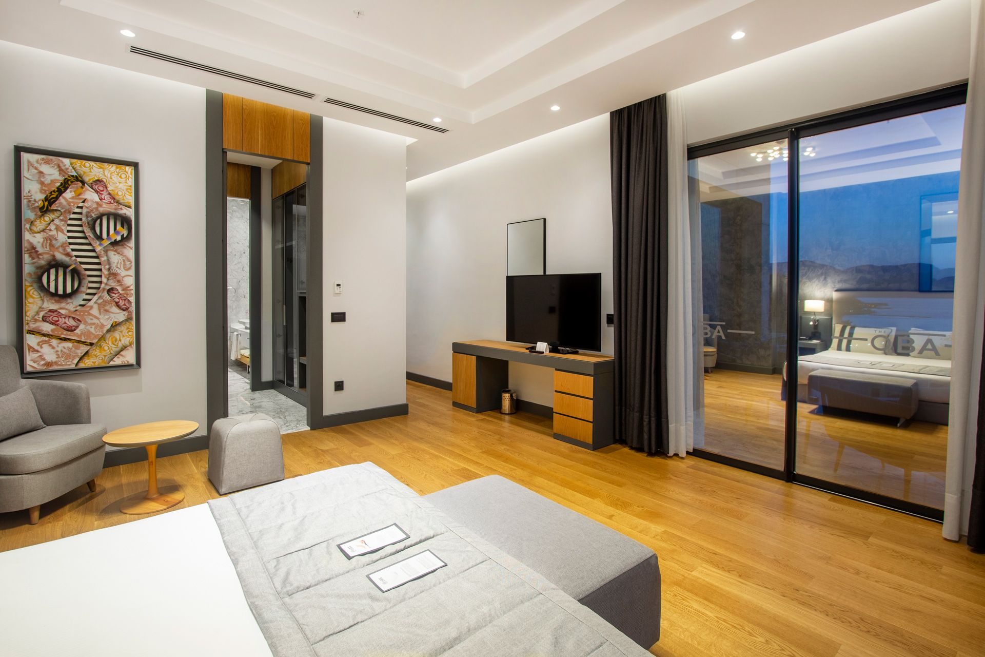 225 m²'lik kullanım alanına sahip olan King Suite odamız deniz manzaralıdır. Otelimizde sadece 1 adet bulunmakta ve özel olarak dizayn edilmiştir. 1 çift kişilik yataklı oda, 2 adet tek kişilik yataklı oda ve 1 oturma odasından oluşmaktadır. Oturma odasında sofa yatak bulunan bu odalarda 2 adet banyo, 3 adet WC ve balkon bulunmaktadır. 2 giyinme odalı, Duşa kabinli ve jakuzilidir. Max. 4 yetişkin 1 bebek konaklaması için uygundur. Ek yatak konulmamaktadır.